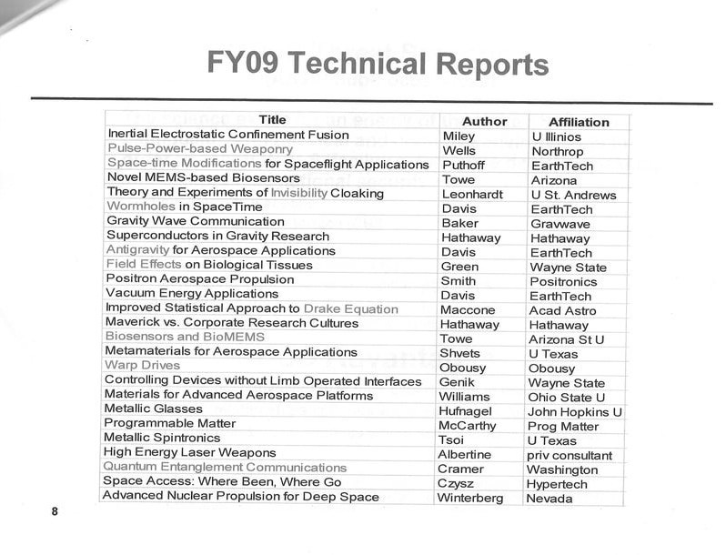 Luego, en julio de 2018, George Knapp y KLAS escribieron y publicaron la lista completa de títulos de DIRD menos una entrada redactada debido a su naturaleza sensible. Esta lista de títulos no incluía los informes completos, pero daba crédito a cada autor. Entre los autores se encuentran el Dr. Richard Obousy y George Hathaway, de Hathaway Research International.