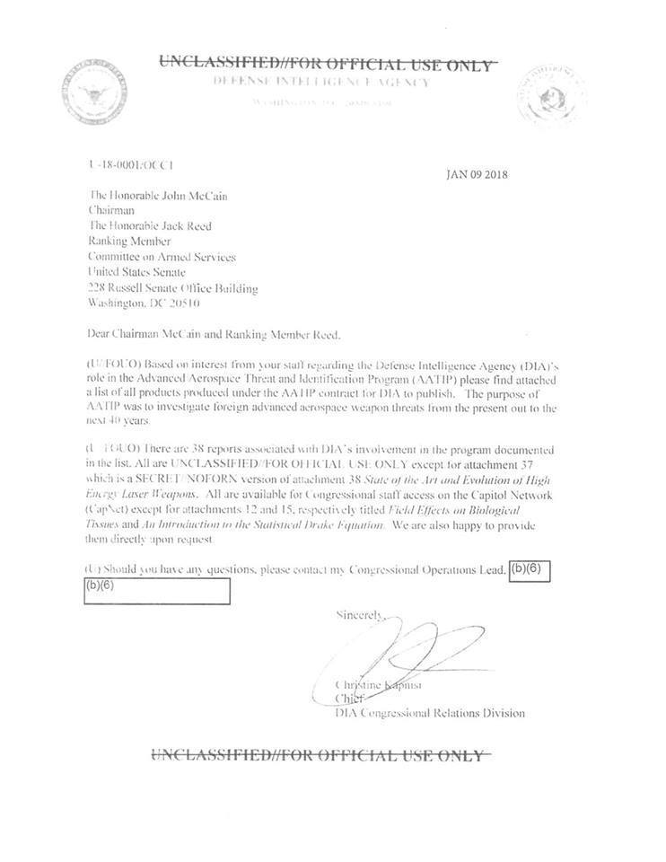Ahora, en enero de 2019, Nick Pope ha publicado el último título DIRD previamente clasificado y ahora no redactado, el trigésimo octavo, así como una interesante carta de presentación que aparentemente se envió al Comité de Servicio a las Fuerzas Armadas del Congreso, de la cual John McCain era el presidente. Pope dice que el documento le fue entregado por la Oficina de Comunicaciones Corporativas de la DIA (Defense Intelligence Agency).