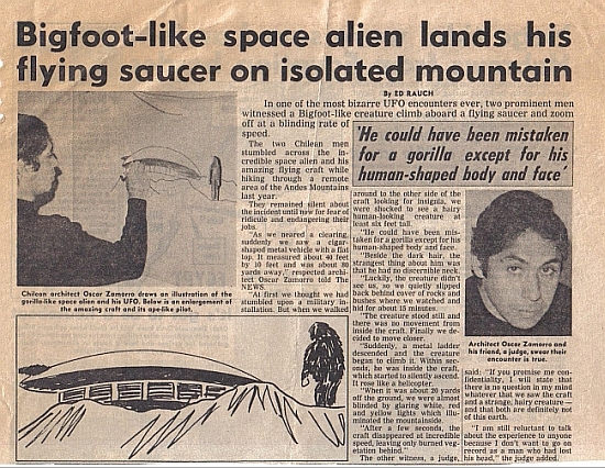 Lo siguiente es un encuentro con un extraterrestre parecido al Bigfoot (Pie Grande o Sasquatch) que aterrizó su platillo volador en una montaña aislada en la Cordillera de los Andes en Chile. Este incidente fue observado por dos testigos excepcionales, un arquitecto y un juez, que se publicó en el periódico estadounidense llamado, “Weekly World News”, el 2 de junio 1981