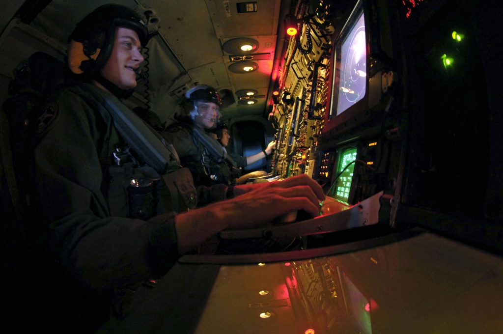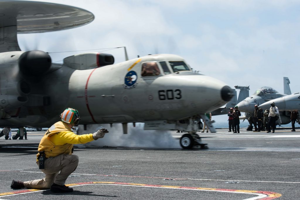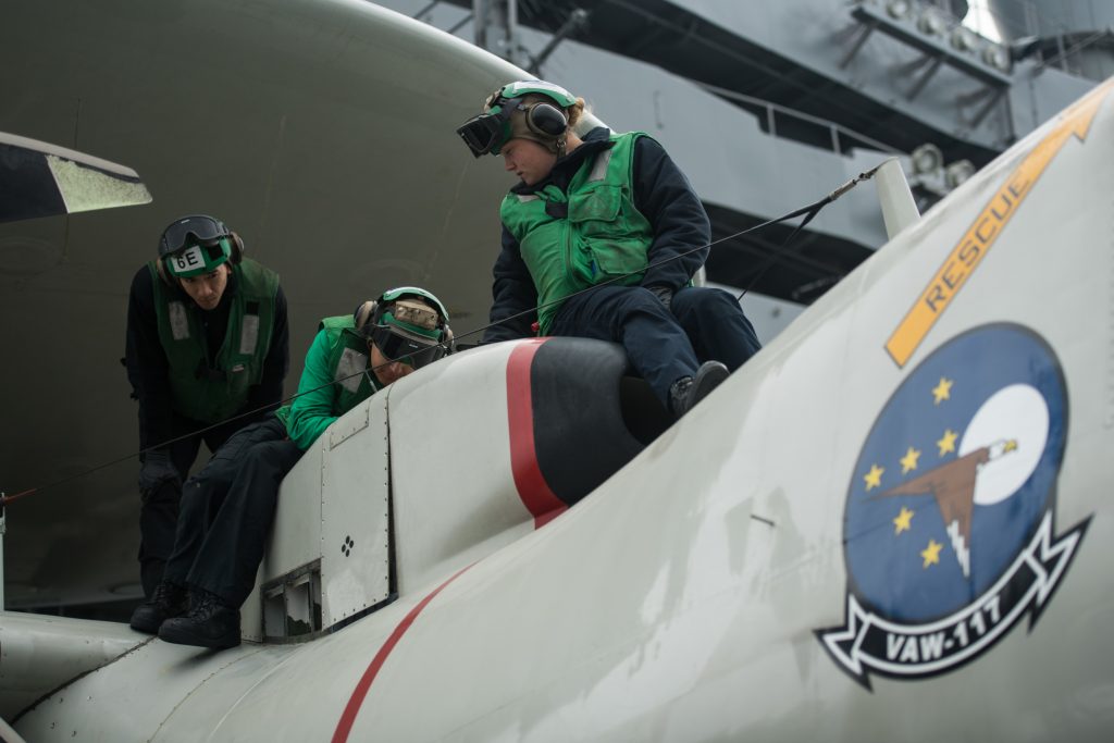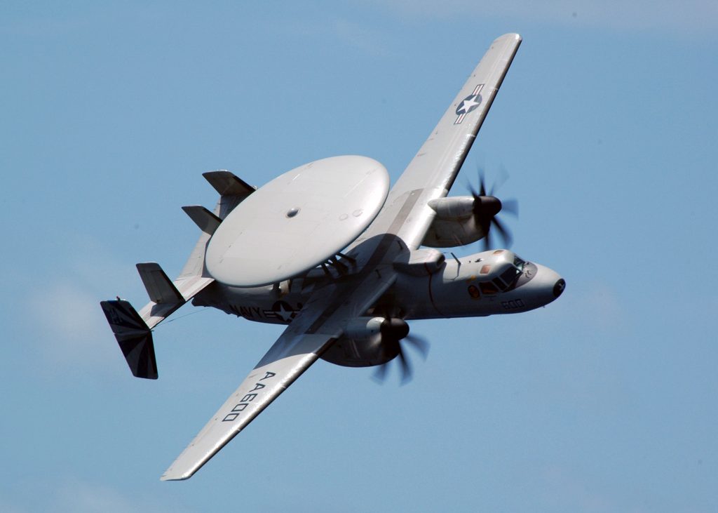| Verificaciones previas al vuelo en los radares de alerta temprana a bordo de un Hawkeye E-2C. |