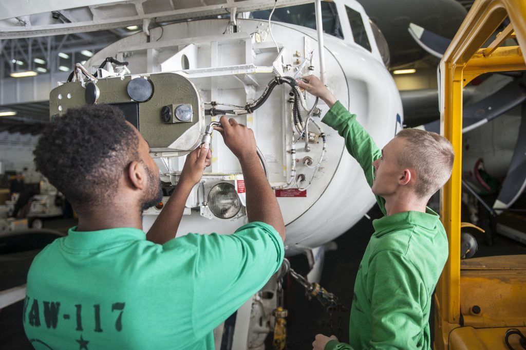 | Aviadores mecánicos estructurales de aviación realizan el mantenimiento en un Hawkeye E-2C. |