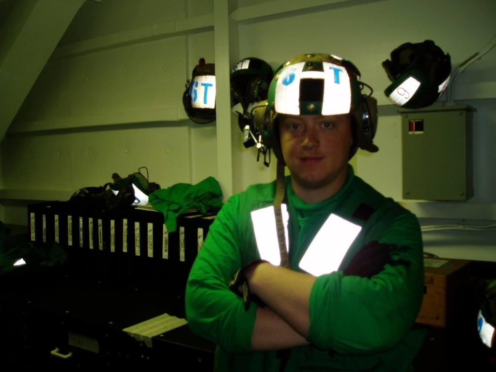 | PJ y equipo, incluido el E-5 “Roger” en la tienda E-2 del USS Nimitz. |
