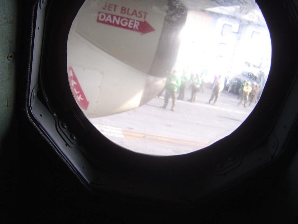 | Vista desde una de las tres ventanas pequeñas en la parte trasera de un Hawkeye. |