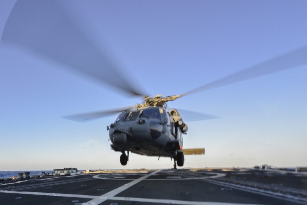 | Helicóptero Sea Hawk aterriza en la cubierta de vuelo a bordo del USS Winston S. Churchill. |